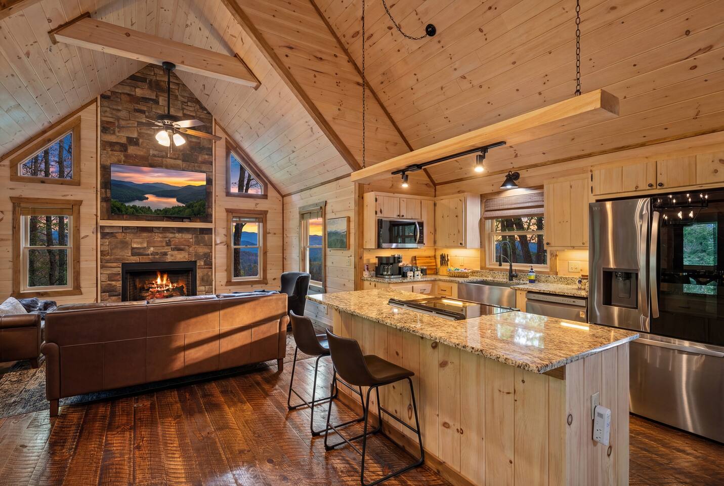 Sleeps 10 | 3 King Suites | Hot Tub | Infrared Sauna | Game Room Pristine luxury. Seven minutes from town. Wooded seclusion that comes alive at dusk. The Bearry is a brand-new mountain sanctuary where spotless modern design meets Blue Ridge's natural beauty. Three king suites with spa-style bathrooms, an outdoor living room with fireplace and TV, and a game room built for long nights—all on paved roads with no 4WD required. Perfect for couples' trips, small families, and friend getaways up to 10, ━━━━━━━━━━━━━━━━━ YOUR EVENINGS HERE ━━━━━━━━━━━━━━━━━ Soak in the 8-person hot tub under string lights and stars. The custom firepit area—complete with a charming bear statue—is built for s'mores and stories. Stream your favorite shows on the outdoor TV while the gas fireplace keeps things cozy. Later, unwind in the infrared sauna with chromotherapy—the perfect recovery after hiking Aska or chasing waterfalls. "The outdoor space was amazing with the outdoor fireplace and TV. We will be back!" — Lisa ━━━━━━━━━━━━━━━━━ SLEEPING ARRANGEMENTS ━━━━━━━━━━━━━━━━━ King Suite 1 - King bed with premium mattress, Smart TV - Ensuite bath with double vanity, walk-in shower King Suite 2 - King bed with premium mattress, Smart TV - Ensuite bath with double vanity, walk-in shower King Suite 3 - King bed with premium mattress, Smart TV - Ensuite bath with double vanity, walk-in shower Game Room (Bonus Sleeping) - Murphy bed for overflow guests - Sofa Total: 3 bedrooms + bonus sleeping, 3 full baths "The double vanities in each bathroom were super accommodating." — Mike & Kaiti ━━━━━━━━━━━━━━━━━ INSIDE THE CABIN ━━━━━━━━━━━━━━━━━ Living Room - Comfortable seating, Smart TV - Wood-burning fireplace - Board games for group nights Chef's Kitchen - Premium cookware, bakeware, and utensils - Oils, spices, and staples stocked - Quality appliances throughout - Dedicated coffee bar - Dining seating for the whole group "We cook at home a lot vs eating out and found the kitchen to be very well stocked with everything we needed. Definitely an A+ stay!" — Toby Game Room - Professional pool table - Dartboard - Wet bar for cocktails - Gas fireplace - Murphy bed ━━━━━━━━━━━━━━━━━ OUTSIDE THE CABIN ━━━━━━━━━━━━━━━━━ Covered Deck - Gas fireplace - Smart TV - Outdoor seating area Hot Tub - Seats 8 - String lights overhead - Starlit soaking after long days Fire Pit - Custom stone pit with seating - Bear statue standing guard - S'mores and stories territory Infrared Sauna - Chromotherapy lighting - Post-hike recovery essential ━━━━━━━━━━━━━━━━━ LOCATION ━━━━━━━━━━━━━━━━━ All paved roads—no 4WD needed. Close to everything, surrounded by nothing but trees and deer at dawn. - 7 minutes to downtown Blue Ridge restaurants and shops - 10 minutes to Lake Blue Ridge and Aska Trail System - Hiking trails at your doorstep "Great location that was close to town and in a nice neighborhood." — Scott ━━━━━━━━━━━━━━━━━ THE DETAILS ━━━━━━━━━━━━━━━━━ - Self check-in via keypad - High-speed WiFi (100 Mbps) throughout - Smart TVs in every room and outdoors - Full-size washer and dryer - Towels and linens provided - Tesla Level 2 EV charging - Three fireplaces (1 wood-burning, 2 gas) - Pets: Up to 2 dogs with fee and approval - No smoking - No events - Maximum 8 guests ━━━━━━━━━━━━━━━━━ Pristine. Thoughtful. Exactly what Blue Ridge should feel like. Book The Bearry before your dates are gone.