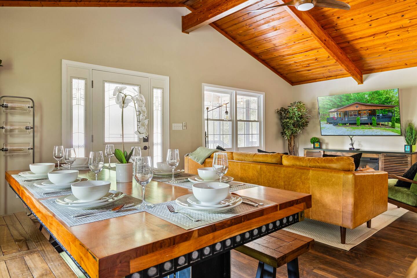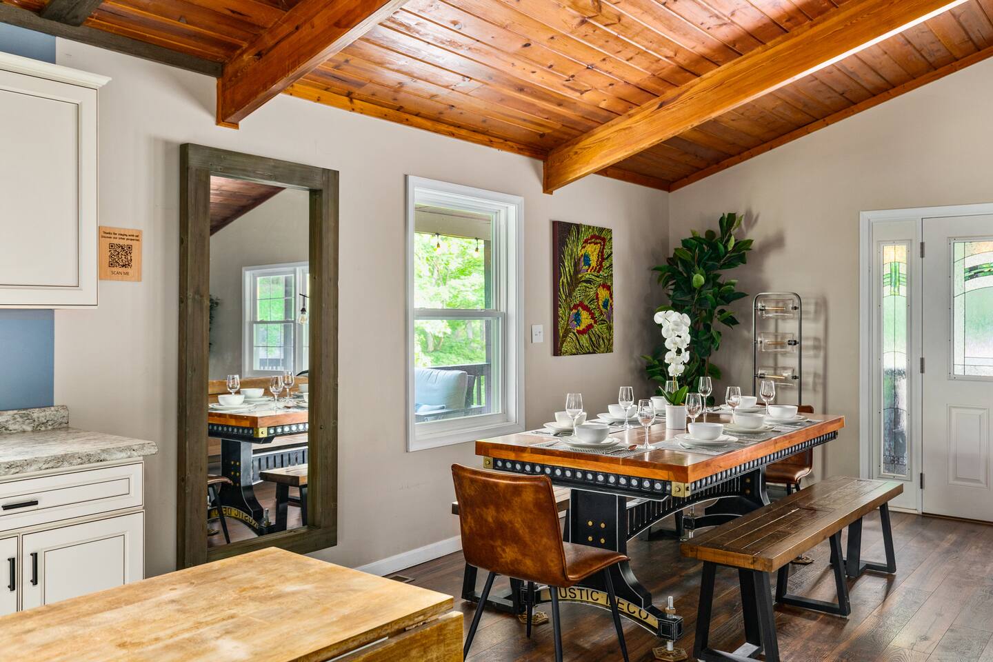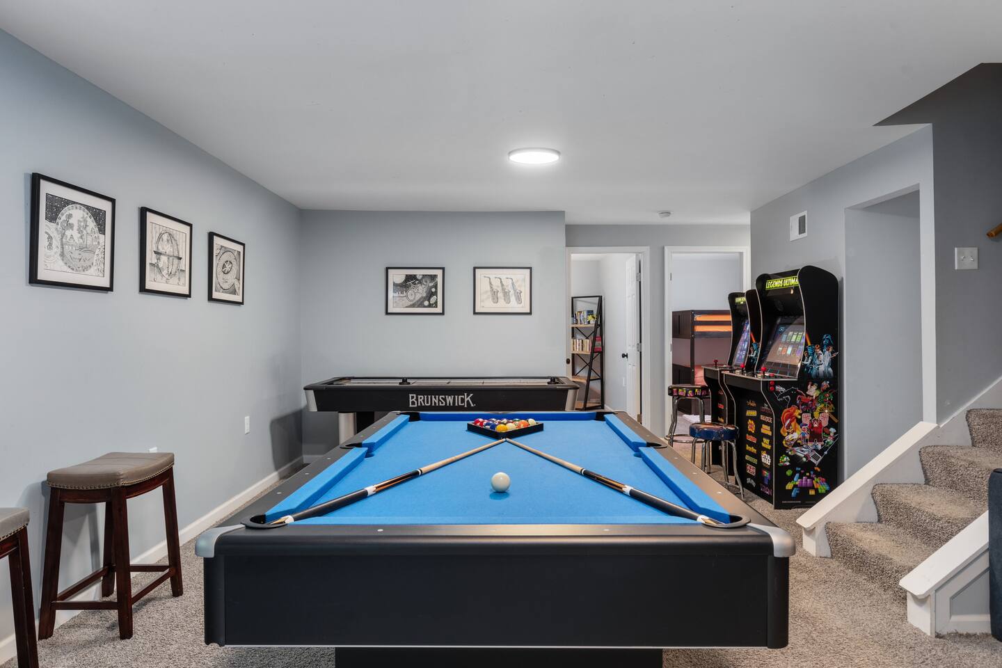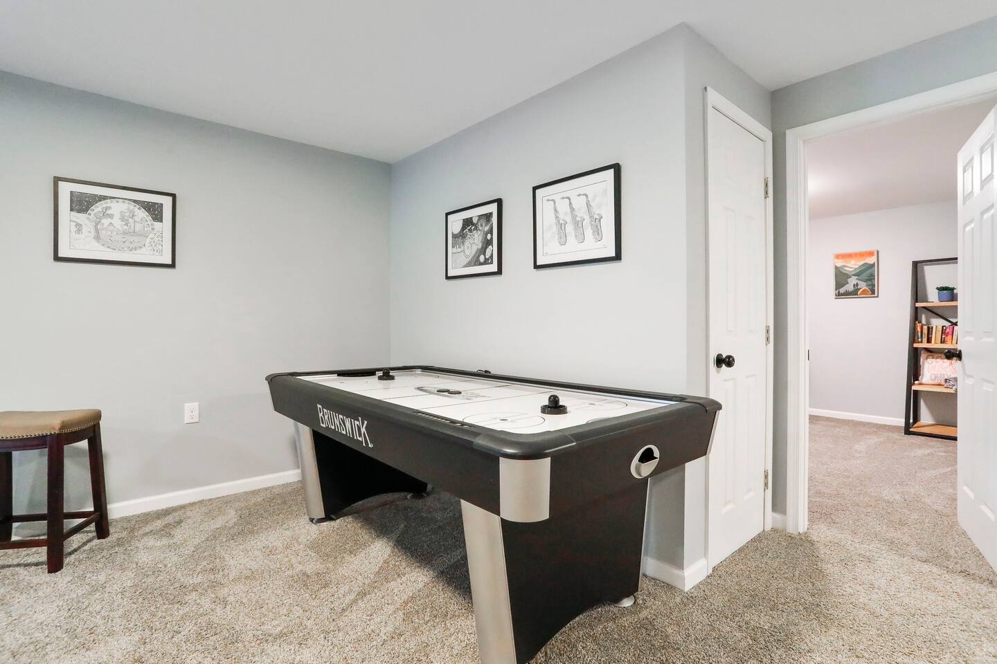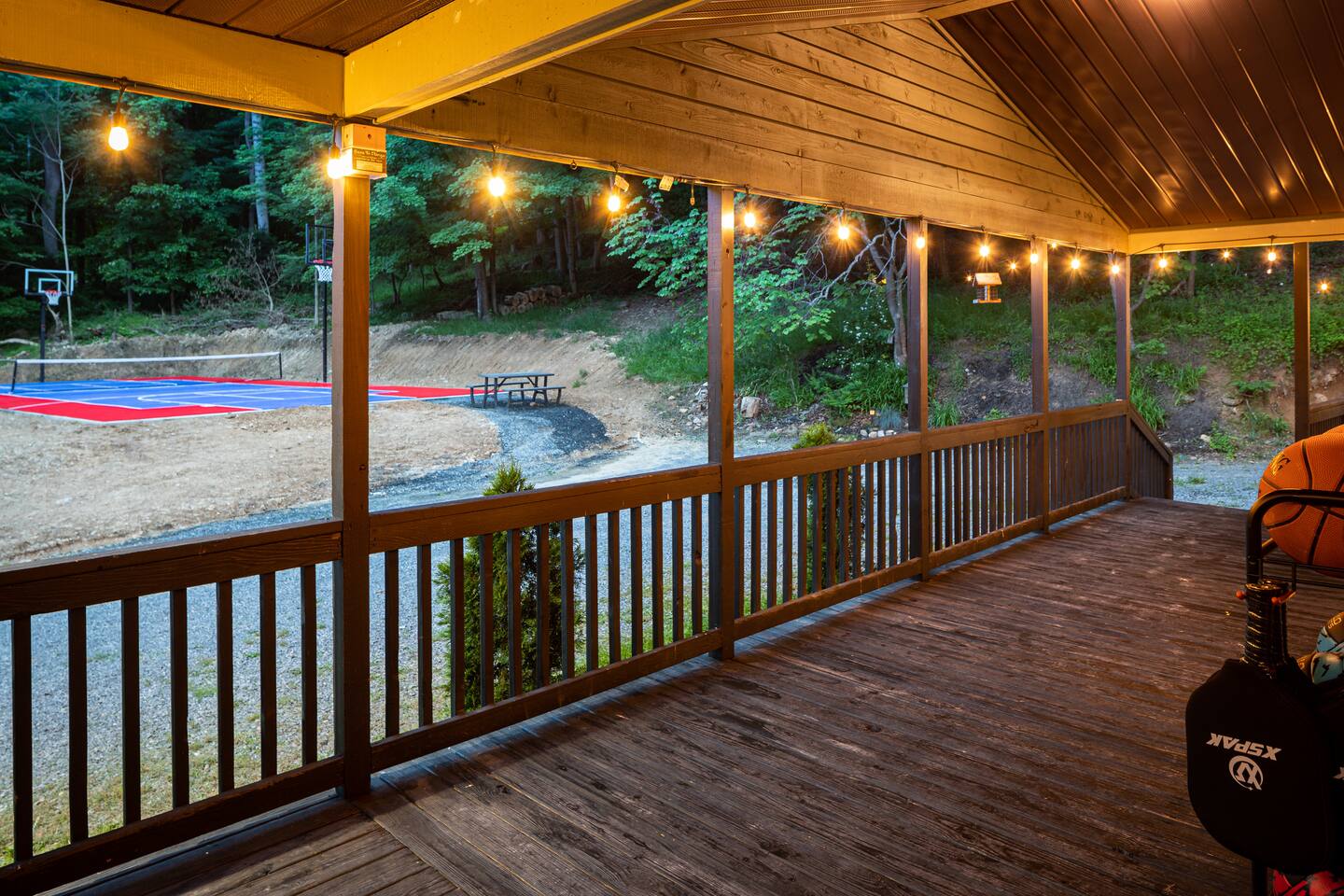 5 private acres. Full sports court. Zero quiet hours. This is the group getaway your crew has been asking for. Tucked into the woods outside Berkeley Springs, BearWood delivers what most cabins only promise: real privacy, serious amenities, and the freedom to be as loud (or as lazy) as you want. Guests call it "absolutely gorgeous" and "worth every dollar"—and after a few rounds of pickleball, a sunset in the hot tub, and a late-night fire pit session, you'll understand why. ━━━━━━━━━━━━━━━━━━━━━━ Sleep Three king bedrooms with quality mattresses give couples their own space. A dedicated bunk room (two full-over-full bunks plus a trundle) means the kids—or the friends who lost at poker—sleep well too. Two full bathrooms keep mornings moving. Sleeps 10 comfortably. ━━━━━━━━━━━━━━━━━━━━━━ Play The backyard is the main event: • Private pickleball and basketball court—no reservations, no waiting • Volleyball for all-ages tournaments • 6-hole disc golf course maintained on-property • 6-person hot tub under dark skies • Two fire pits (main yard + porch) for s'mores and late-night conversations Inside, the game room holds its own: pool table, air hockey, arcade games, and a board game collection deep enough to settle grudges. ━━━━━━━━━━━━━━━━━━━━━━ Stay In Two 75" smart TVs with Apple TV handle movie nights. The electric fireplace sets the mood. Fast WiFi and a dedicated workspace mean you can take that call—but you probably won't want to. ━━━━━━━━━━━━━━━━━━━━━━ Cook & Gather The fully equipped kitchen has everything you need to feed a crowd: electric stove, cookware, dinnerware. The dining table seats all 10, because the best meals happen when everyone's at the same table. ━━━━━━━━━━━━━━━━━━━━━━ Explore Berkeley Springs America's first spa town sits minutes away—mineral baths, massage therapy, and a walkable downtown with local breweries and wineries. Hiking, biking, kayaking, and horseback riding are all close. When you want to venture further: Whitetail Resort (26 miles), Harpers Ferry, Shenandoah National Park, Antietam Battlefield, and Luray Caverns are all easy day trips. ━━━━━━━━━━━━━━━━━━━━━━ Details Parking: Space for 8 vehicles Pets: Welcome (fee applies) Hot water: On-demand system—no cold surprises Security: Exterior cameras only, no indoor monitoring As seen on: YouTube cabin tour supporting St. Jude ━━━━━━━━━━━━━━━━━━━━━━ The Bottom Line BearWood isn't a cabin where you sit around wondering what to do. It's a place where the weekend flies by because you're too busy playing, eating, laughing, and collapsing into the hot tub. Guests leave saying it "has everything you could ask for." They're not wrong.